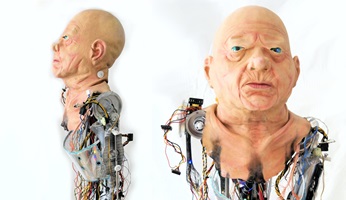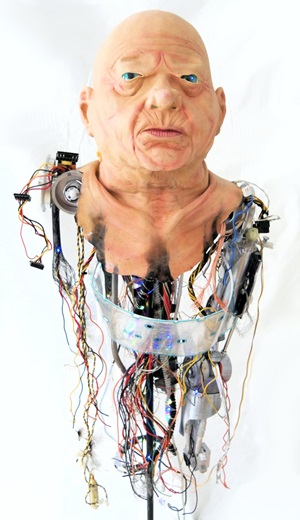 Der Rest fehlt. So bleibt nur der Kopf mit den Verbindungsanschlüssen zum Körper. Zeigt durch LEDs bei Ansprache noch Restaktivität in seinen Kabeln. Höhe ca. 150 cm. USB-Steckernetzteil erforderlich.
